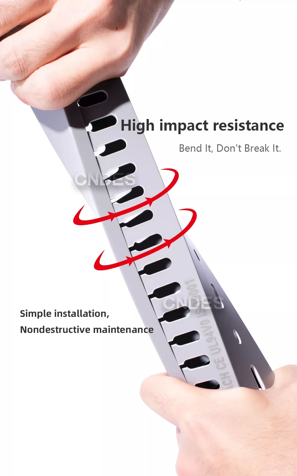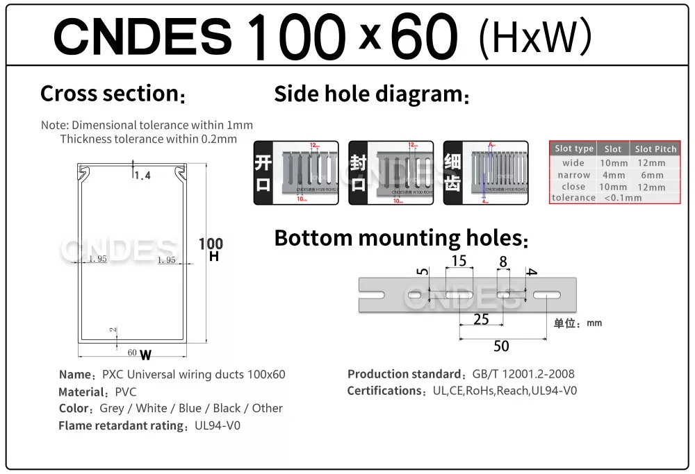 Прецизионные пазы — точные канавки — качественные воздуховоды из ПВХ 100×60 для электрических панелей имеют единую конструкцию канавок, что позволяет кабелям аккуратно выходить из любого положения; в качестве опции доступны нестандартные схемы отверстий.