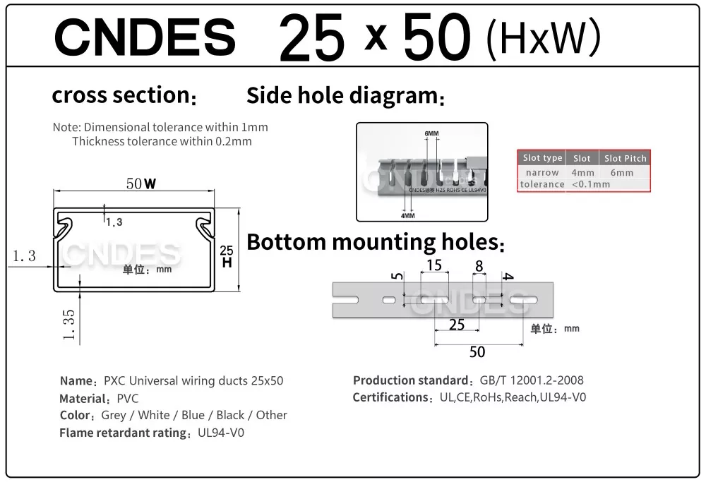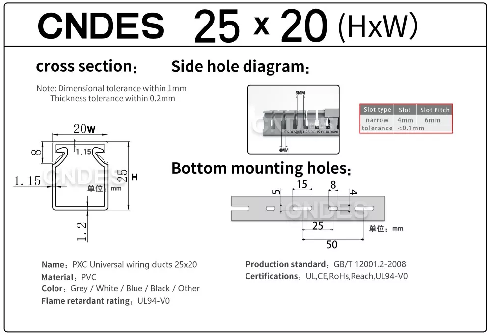 Благодаря нашему независимо разработанному высокоточному штамповочному оборудованию в сочетании с уникальным процессом сегментированной автоматической резки CNDES может гибко производить продукцию в различных спецификациях, включая высокопроизводительные воздуховоды для панелей управления из ПВХ с прорезями высотой 25 мм, удовлетворяющие разнообразные потребности клиентов в шкафах управления и электрических системах.