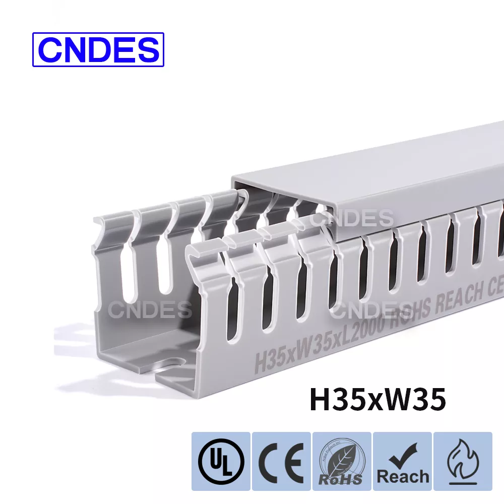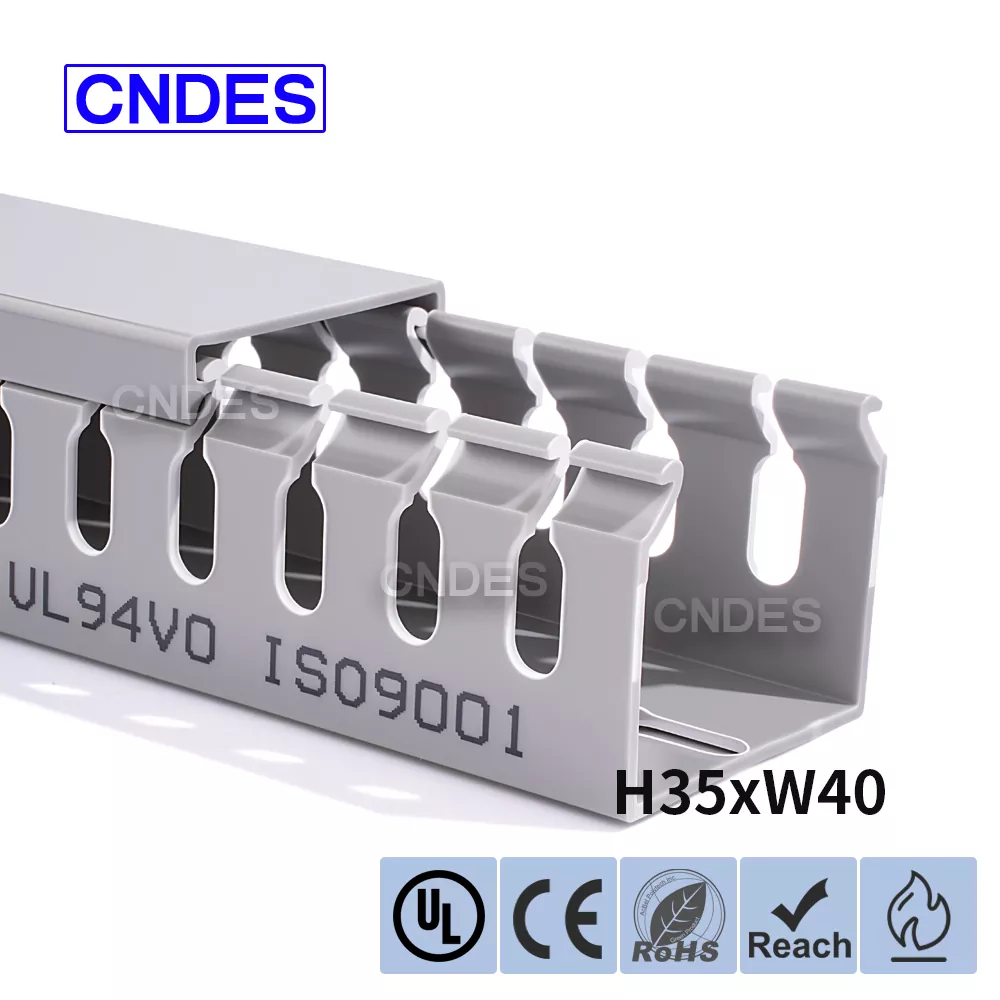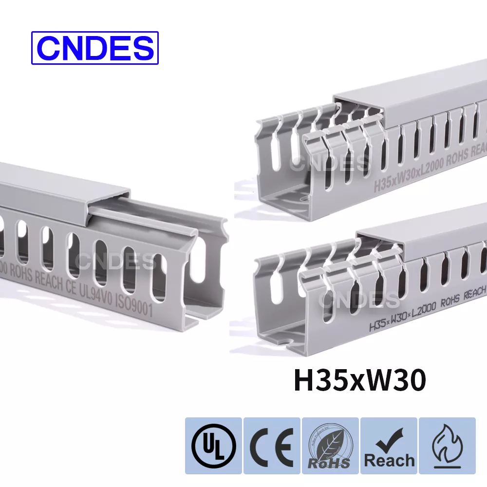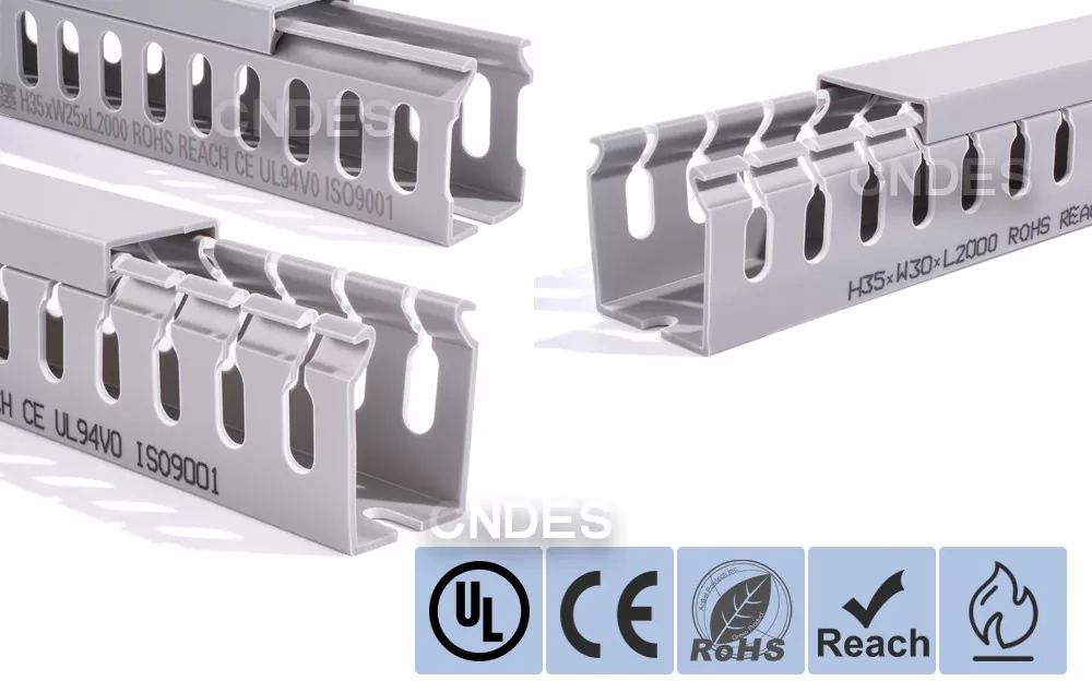 Канал для прокладки проводов из ПВХ с прорезями высотой 35 мм, изготовленный китайской компанией CNDES, состоит из жесткого основания из ПВХ и съемной крышки. В основании имеются равноудаленные пальцеобразные бороздки, проштампованные с обеих сторон, образующие «гребенчатые зубья». Эти зубья можно сломать вручную, что позволяет проволоке выходить горизонтально из любого положения. Крышка легко защелкивается на место, сохраняя аккуратный внешний вид. Ряд монтажных отверстий внизу соответствует стандартному расстоянию DIN 43659. Его можно быстро прикрепить к панелям, каркасу шкафа или аналогичным конструкциям с помощью винтов M5 или заклепок.