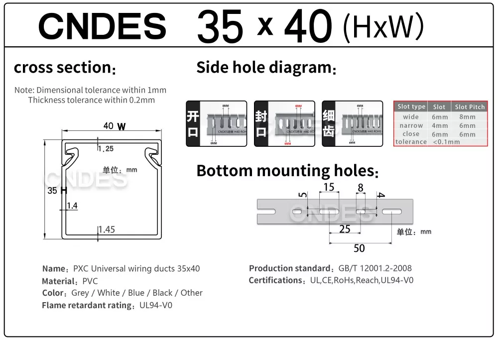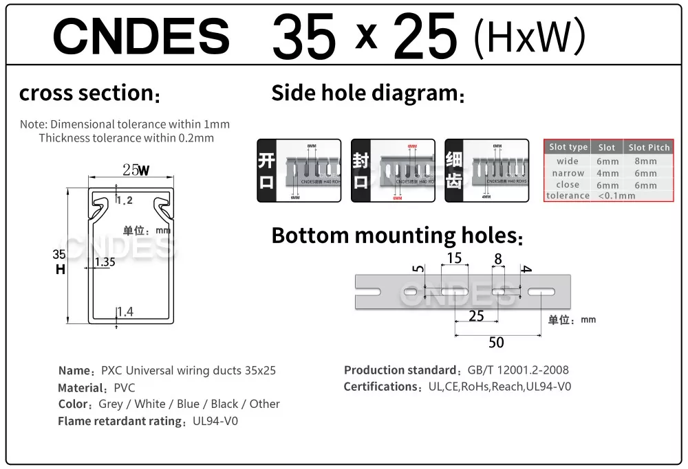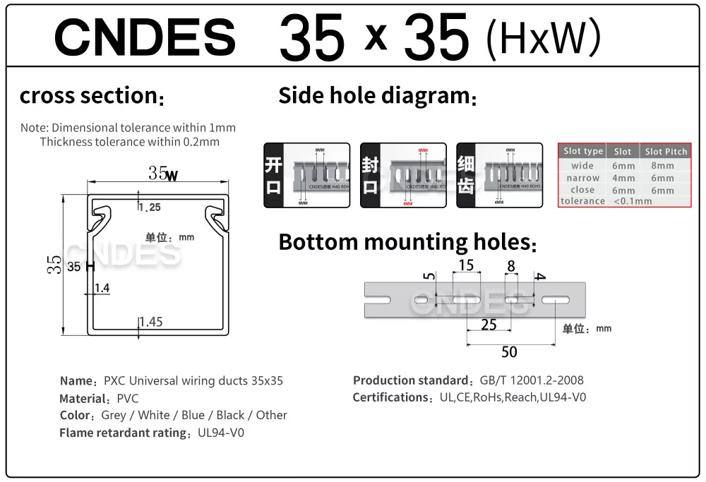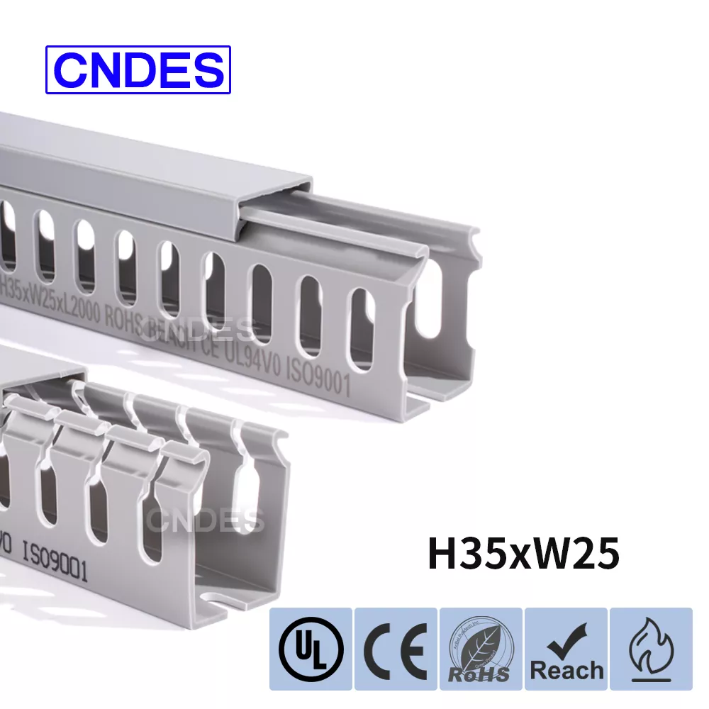Канал для прокладки проводов из ПВХ с прорезями высотой 35 мм, изготовленный китайской компанией CNDES, состоит из жесткого основания из ПВХ и съемной крышки. В основании имеются равноудаленные пальцеобразные бороздки, проштампованные с обеих сторон, образующие «гребенчатые зубья». Эти зубья можно сломать вручную, что позволяет проволоке выходить горизонтально из любого положения. Крышка легко защелкивается на место, сохраняя аккуратный внешний вид. Ряд монтажных отверстий внизу соответствует стандартному расстоянию DIN 43659. Его можно быстро прикрепить к панелям, каркасу шкафа или аналогичным конструкциям с помощью винтов M5 или заклепок.