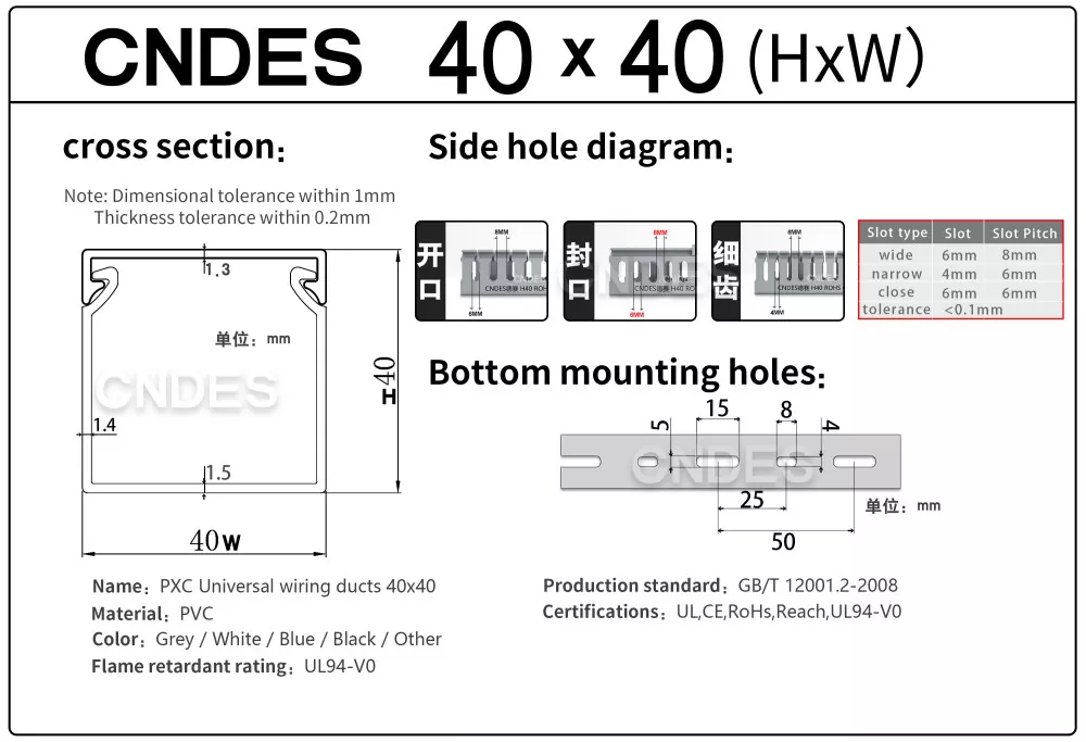Вы можете быть уверены, что купите качественный кабельный канал из ПВХ 40 × 40 с крышкой на нашем заводе (CNDES). Высота 40 мм и ширина 40 мм.