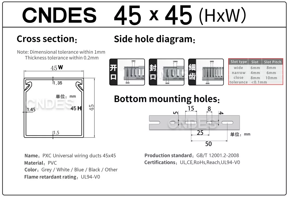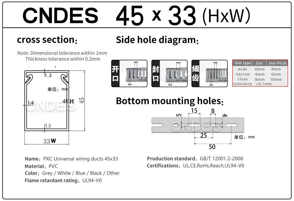 Как профессиональный производитель, мы хотели бы предоставить вам канал CNDES с прорезями для покрытия проводов из ПВХ высотой 45 мм. В том числе 45*25, 45*33, 45*45.
