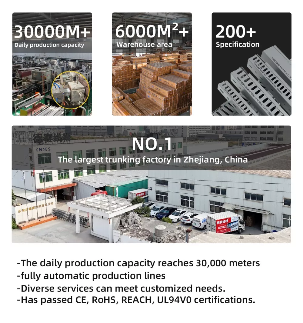 CNDES, как профессиональный завод по исследованиям, разработкам и производству кабельных каналов из ПВХ с черными прорезями в Китае, специализируется на массовом производстве, строгом контроле качества ISO и обслуживании OEM/ODM. Черные корпуса обычно используются в сценариях, требующих скрытой проводки (например, в домашних кинотеатрах или офисах) или для различения различных функциональных цепей (например, высоковольтных и низковольтных линий), тем самым повышая эффективность управления.